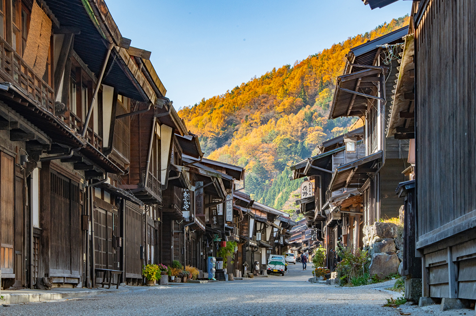 奈良井宿の町並み。木曽の豊かな森林をバックに、古民家の並ぶ景色が約1kmにわたって続いています。
