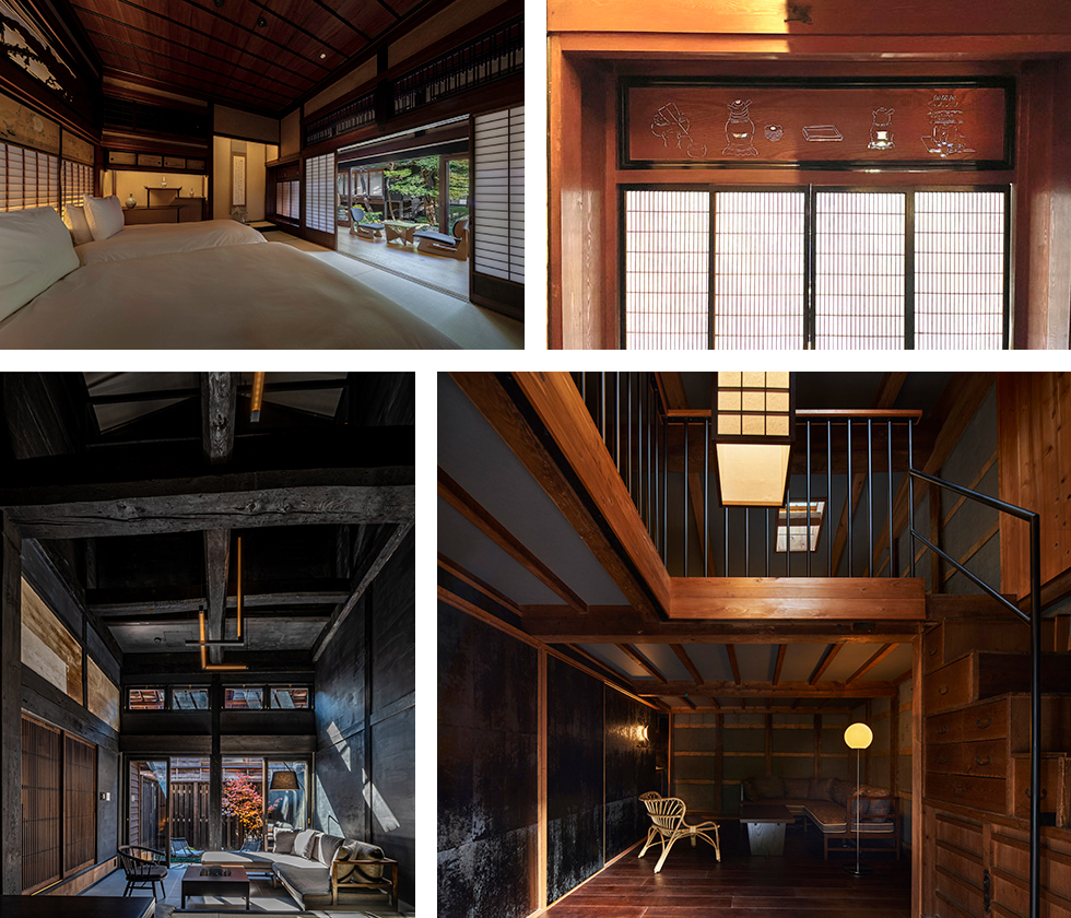 下段右:「百七」。漆器や調度品などが多く収納されていた家財蔵を再生した客室に、地元の漆職人による漆和紙の仕上げを施しました。