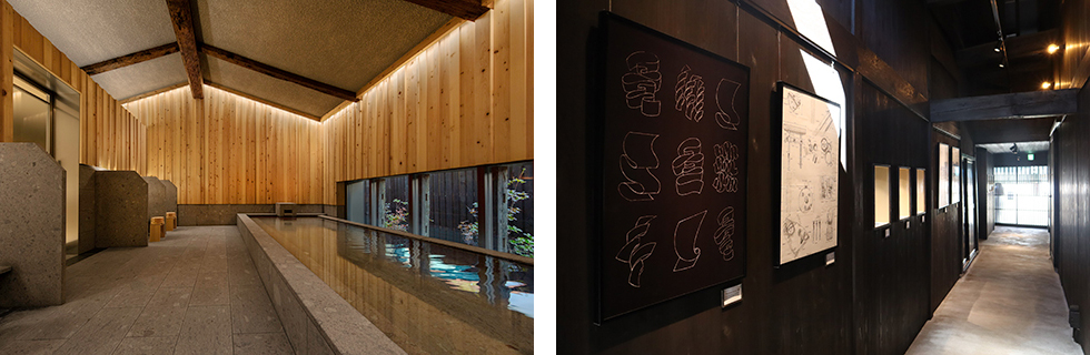 温浴施設「山泉」では、木曽五木の香る内装空間において、酒の仕込み水に使われる信濃川源流の柔らかい山水に浸り、バイオマスボイラーによる自然エネルギーで温まることができるなど、木曽谷の自然の力を全身で感じることができる温浴施設となっています。はなれである「豊飯豊衣」内のギャラリーでは、奈良井宿の歴史を学ぶことができるようになっており、利用者がさまざまな場面で地域との結びつきや奈良井宿の持つストーリー性を感じられるような工夫を施しました。