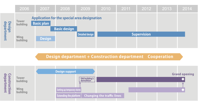 This project began by submitting an application for a “special area” designation to relax building regulations and the application was accepted in only six months (this is exceptionally fast) in cooperation with the customer. Before construction began, the customer was advised of the design process so that the design process could take their business plan into account and a consensus was thereby reached in a timely manner. At the same time, the design included a highly accurate production plan that reflected the production information such as construction techniques. After the construction began, functions and quality were guaranteed by Takenaka’s skills in technological development and engineering while ensuring the optimum construction period based on the construction plan that took environmental and safety issues into consideration. Our design and construction departments advanced the project by contacting each other at every stage from the beginning of the design phase to completion.