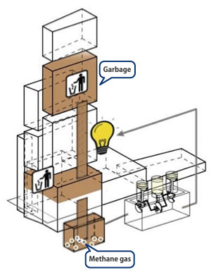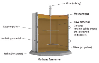 Biogas power generation Biogas (used as fuel) is produced from the garbage generated by the department store and hotel. This system eliminates the emission of garbage from the building, and the produced biogas is used as fuel to generate electricity and supply hot water. |