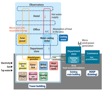 By combining highly efficient and low environmental load equipment, a space-saving and easily maintained energy system is constructed that takes redundancy and safety into consideration. For the existing heat source that has deteriorated over the years, heat is provided if it is affordable and its use can be justified. Also, highly efficient heat pumps that recover A/C waste heat and biogas generators are installed. To reduce the consumption of valuable energy such as electricity and gas, natural energy is utilized. |