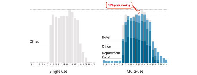A lot of energy is used at hotels during the night, at offices during the day on weekdays, and at department stores on weekends and holidays. Leveling energy usage through the utilization of differences in business hours contributes to energy conservation.