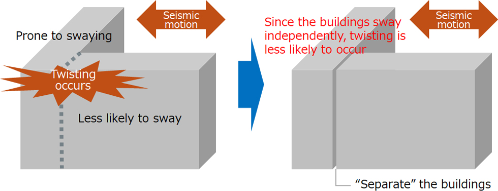 In the case of buildings with complex shapes like OSAKA UMEDA TWIN TOWERS SOUTH, there is a risk that “twisting” during an earthquake could cause the building to sway even more violently. For this reason, a method is often used to prevent twisting by dividing the structure (building) into simpler shapes such as rectangular cuboids. However, this method also has its drawbacks. Where the structures are separated, "expansion joints" are installed to close gaps and allow people and goods to pass through, but these joints move significantly during an earthquake, so fixtures and equipment cannot be placed on top of them. This means that the layout of the department store's sales floors will be significantly restricted at Osaka Umeda Twin Towers South.