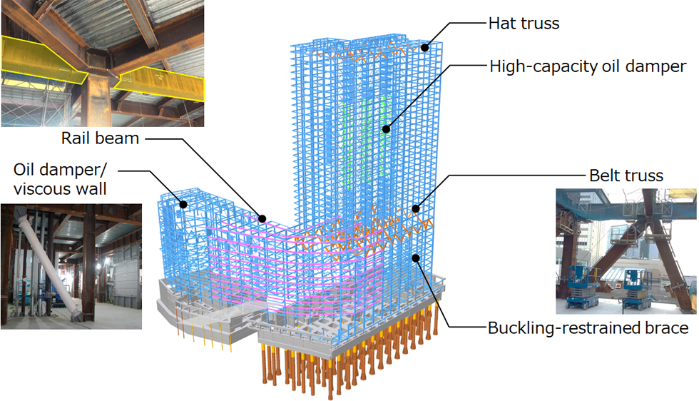 In order to create an earthquake-resistant building without using expansion joints, we adopted our newly developed "V-Frame Vibration Control Structure,” which combines various elemental technologies, such as oil dampers, belt trusses, and rail beams, to prevent twisting and reduce shaking during earthquakes in buildings with complex shapes.