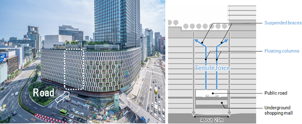 Temporary braces are installed every few floors to transfer the force (weight) of the area above the road to the adjacent building on both sides (center of the image above). After that, when the columns are cut, some of the force that had previously been transmitted to the lower floors is transferred to the building on both sides. Once the "suspension structure," including the suspension braces, is complete, the columns are connected, the building is lifted up, and the temporary braces are removed (right side of the image above).