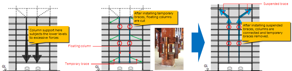 The challenge here was how to support the building until the "suspension structure" was completed. If we tried to support it with columns like a normal building, excessive force would be placed on the lower floors (see left side in the diagram below). Therefore, we devised a new construction method (patented), “deliberately cutting the suspension columns during construction.”