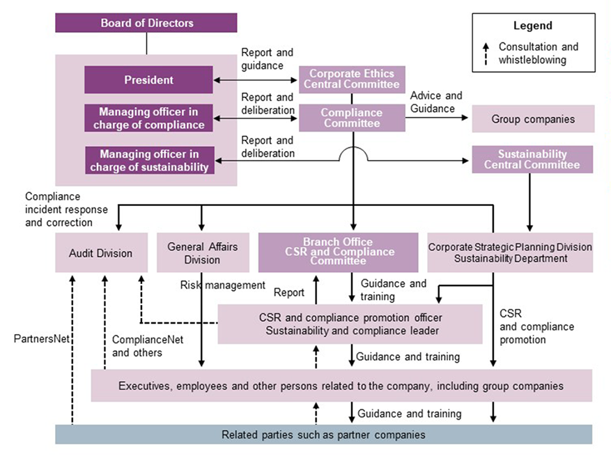 In order to ensure and promote compliance, a Compliance Subcommittee has been established under the Corporate Ethics Central Committee. In addition to identifying important risks, establishing action policies and checking progress, this subcommittee checks the response status of individual cases and give instructions on improvements. Committees at branches then deploy these policies and measures, and a facilitator is assigned at each business location.