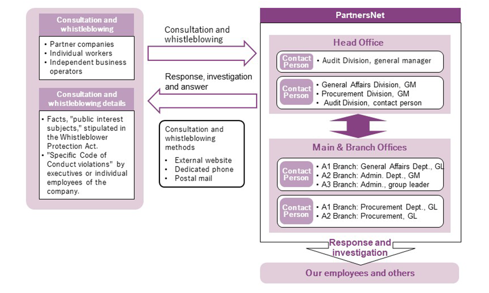We have established a reporting system that allows executives and employees of the company, group companies, and partner companies, as well as workers and retirees of these companies, to consult with and report to us if they discover any violations of laws or regulations, fraudulent acts, or other compliance violations, or if they have reason to believe that such violations are being carried out.