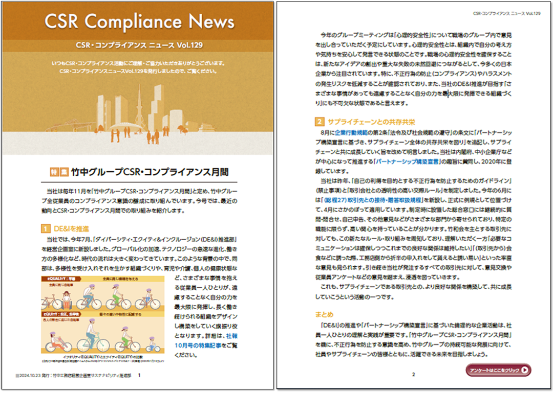The Takenaka Group publishes CSR & Compliance News five times a year for all employees of the Takenaka Group. VOL.129 (published on October 23, 2024) introduced the role of the Diversity, Equity & Inclusion (DE&I) Promotion Department, which was newly established in July, as well as “psychological safety,” which was the theme of the group discussion during CSR and Compliance Month with the aim of raising awareness of human rights.