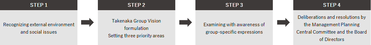 The Takenaka Group has established the Takenaka Group Management Vision to create new value and meet social needs. With a "regenerative" mindset and posture, our group will work in an integrated manner across three priority areas. In formulating the Medium to Long-Term Management Plan 2030, we will identify major objectives (materiality) based on this vision and three priority areas, establish specific action plans and targets for their realization, and develop business activities accordingly.