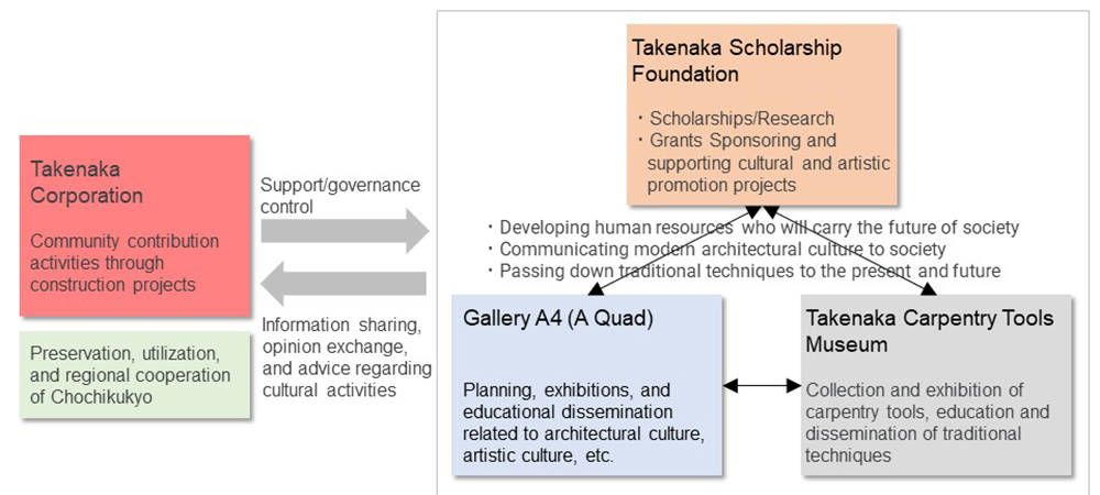 In addition to preserving, publicly showing, and utilizing the Important Cultural Property, Chochikukyo, and publishing approach, we also promote mécénat activities, including the dissemination of architectural culture, in cooperation with three corporate foundations: Takenaka Scholarship Foundation, Takenaka Carpentry Tools Museum, and Gallery A4 (A Quad).