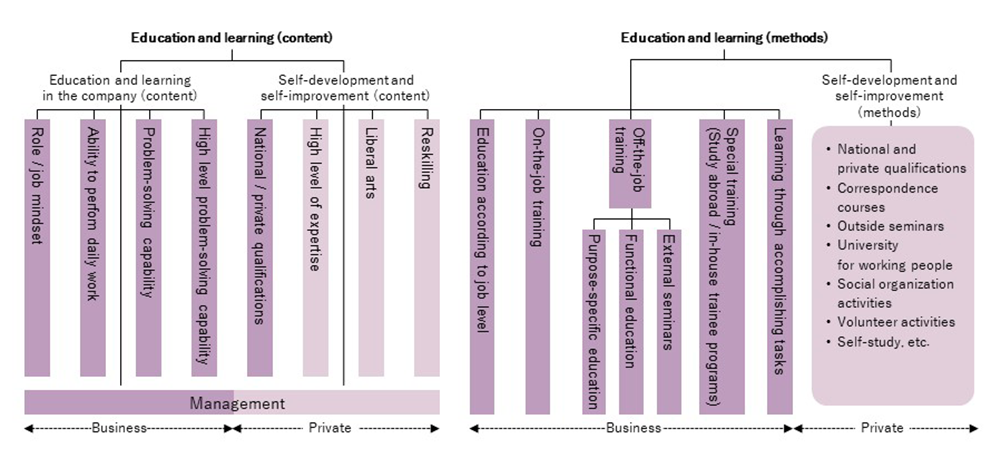 The Career Development Program is designed to promote effective development of overall competency skills by grasping the abilities of individual employees, utilizing them for personnel management, and assigning the right person to the right position and job in accordance with their mid- to long-term career plans. Furthermore, we aim to ensure fair treatment by reflecting employees’ overall competency via an internal grading system and other means.