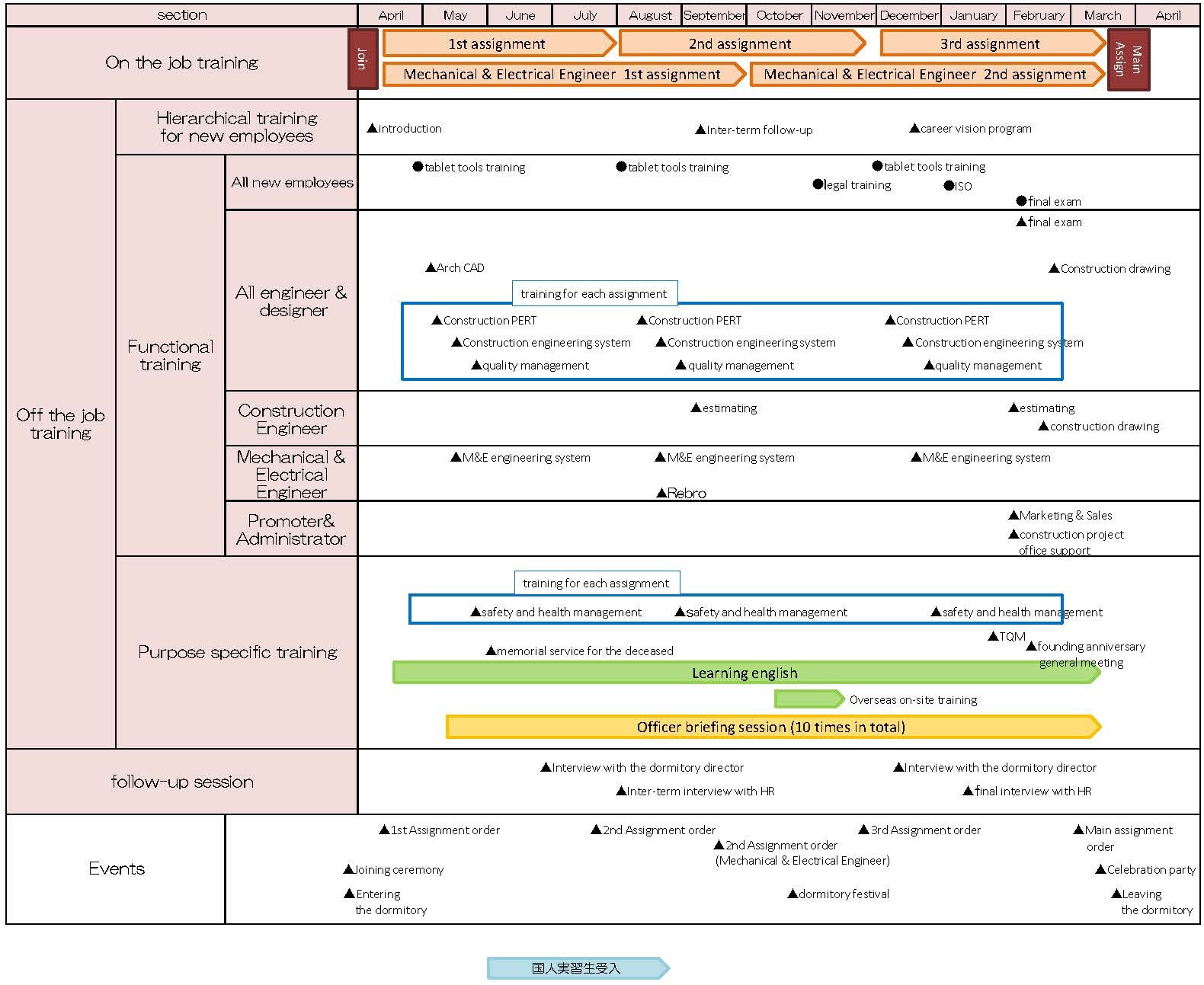 During this time, they acquire much knowledge and many skills. Their perspectives are also broadened by experiencing multiple departments in a short period of time (typically four to six months per posting to each department). This one-year period is also an important time to form personal networks between classmates and people in the divisions where they rotate. These are the foundation of each individual's career and the cornerstone of Takenaka Corporation's overall strength and human resource capabilities.