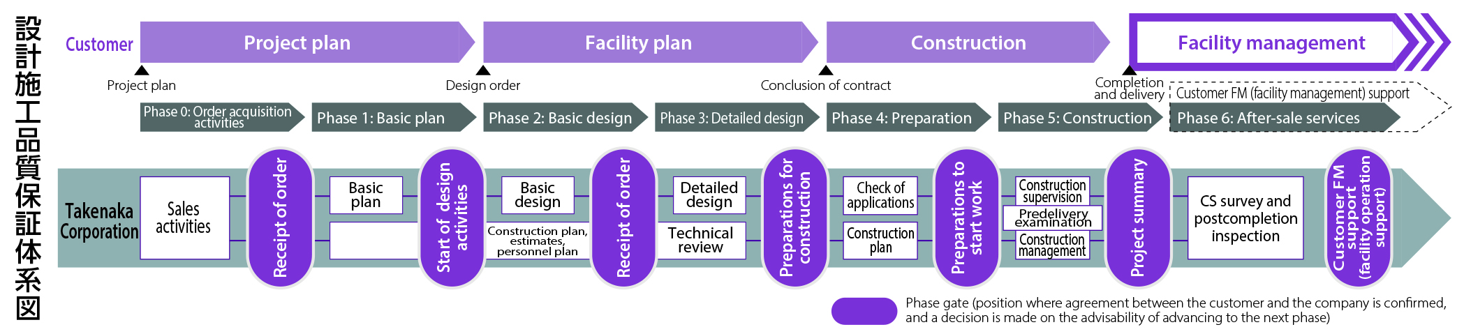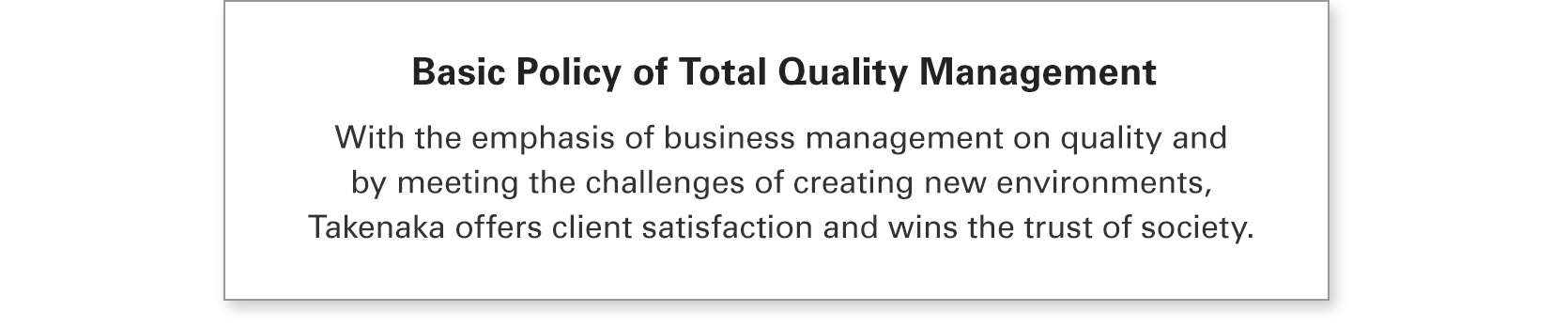 At Takenaka Corporation, we define “quality management” as “Earn customer satisfaction and society’s trust through management that persists in stressing quality and challenging the creation of new environments,” which is our Total Quality Management Basic Policy. Furthermore, the “quality” in quality management does not simply mean the quality of buildings, but it also includes the “quality of overall corporate activities” as a member of society. We therefore continue to work relentlessly to improve “quality” and to maintain “quality management.”