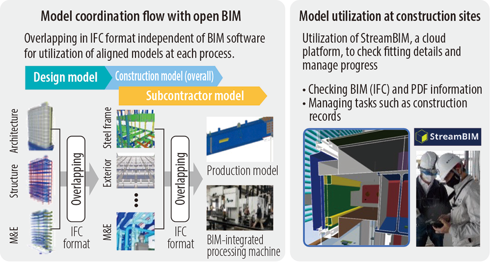 In order to deploy BIM and build in quality, it is essential utilize BIM software that meets the needs of designers, builders, and partner companies. We are therefore deploying Open BIM based on sharing and coordination in the IFC format, which is an international standard format that does not depend on specific BIM software. In this way, we are building in quality while utilizing data in models from design, construction and cooperating companies from the design stage through to the construction stage.