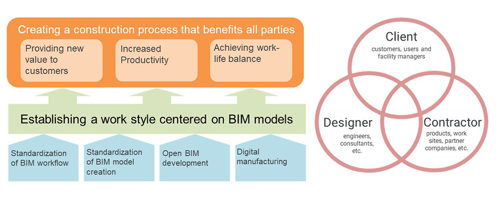 Since there is no single best BIM utilization method, we would like to work with our partner companies on each type of construction project and continue to study the best BIM utilization method through repeated discussions and dialogs. Additionally, by converting business processes to a BIM model base and establishing a business style centered on the BIM model, we hope to achieve a construction process that benefits everyone involved in the project, including customers.