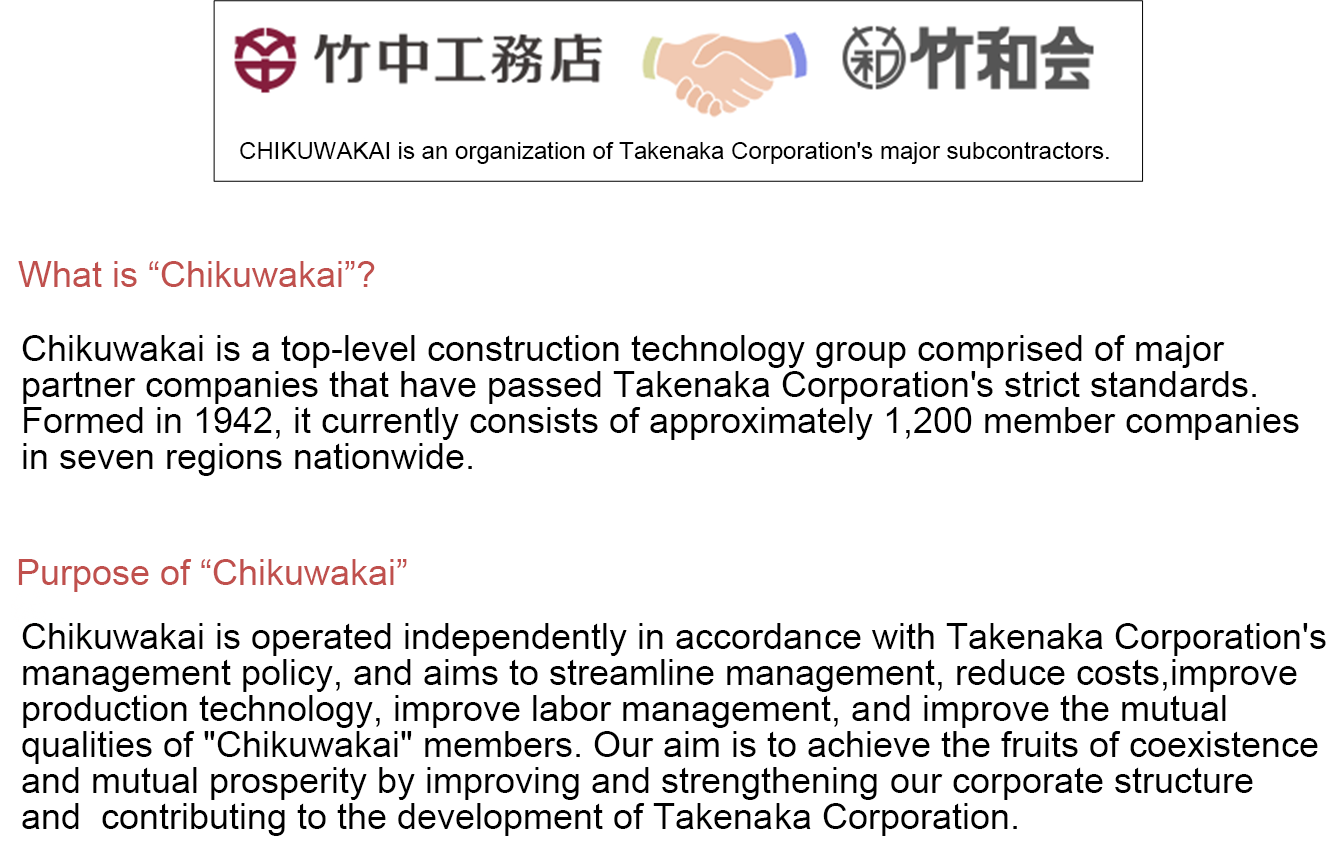 Chikuwakai is a top-level construction technology group made up of our major partner companies, which have passed the strict standards of Takenaka Corporation. Formed in 1941, it currently consists of more than 1,200 member companies in seven regions nationwide.