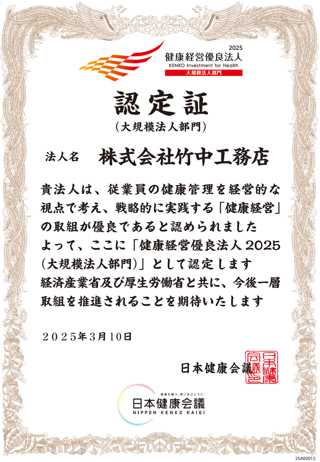 Since 2019, Takenaka has been continuously certified as a Health & Productivity Management Outstanding Organization by the Ministry of Economy, Trade and Industry. This also included the same recognition in 2023*.