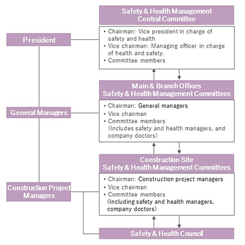 A panel of experts has been established as an advisory body to the president to promote safety and health throughout the company under the control of committees at each branch and office. In promoting this initiative, the Human Resources Department, company doctors, the Health and Safety Committee, and Health Insurance Society are working together to maintain employee health management and health promotion measures, and strengthen systems.